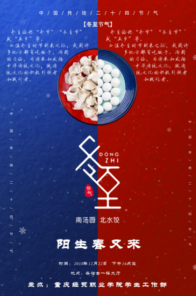 校学工部 12月22日,正值冬至时节到来之际,为传承和发扬中华传统文化,做传统文化的积极引领者和践行者。既让同学们感受到学校的温暖,又让同学们缓解思乡之苦,我院学生工作部和团委宿管会在各学生公寓大厅举办“冬至阳生春又来”主题教育活动,学生代表共200多人参加活动。