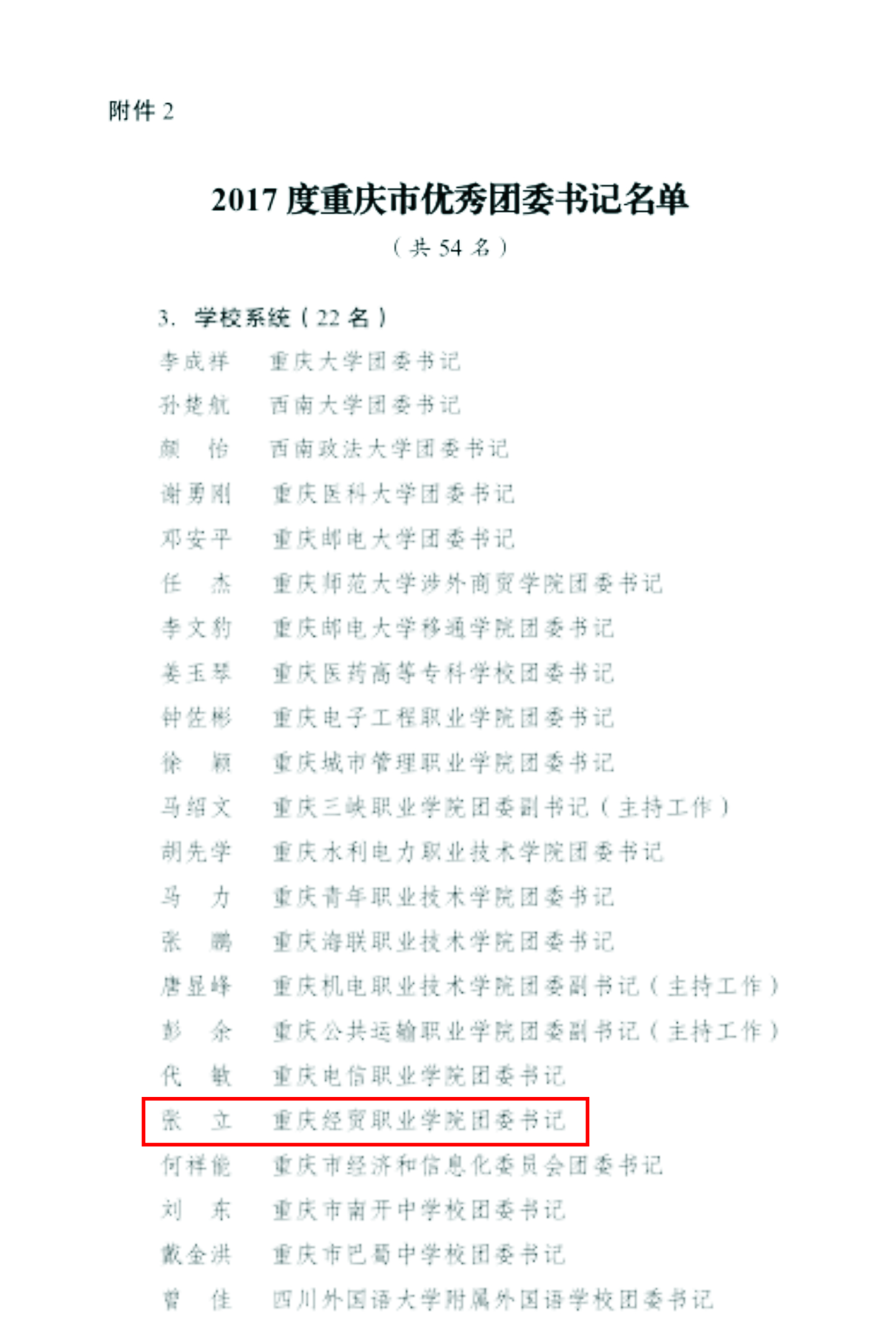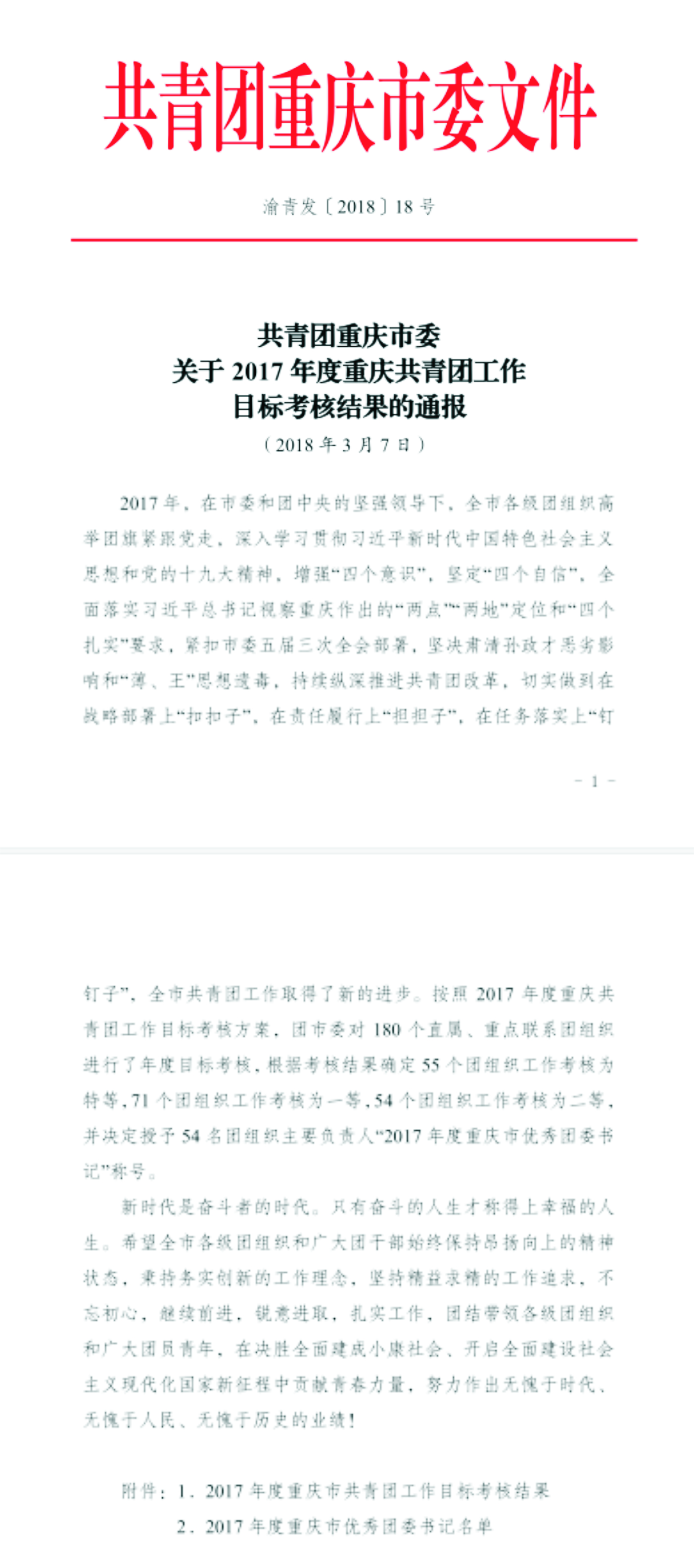 近日,共青团重庆市委下发了《关于2017年度重庆共青团工作目标考核结果的通报》(渝青发〔2018〕18号)文件,我院团委荣获2017年度重庆市共青团工作目标考核“特等团组织”殊荣,院团委书记张立同志荣获“2017年度重庆市优秀团委书记”称号。