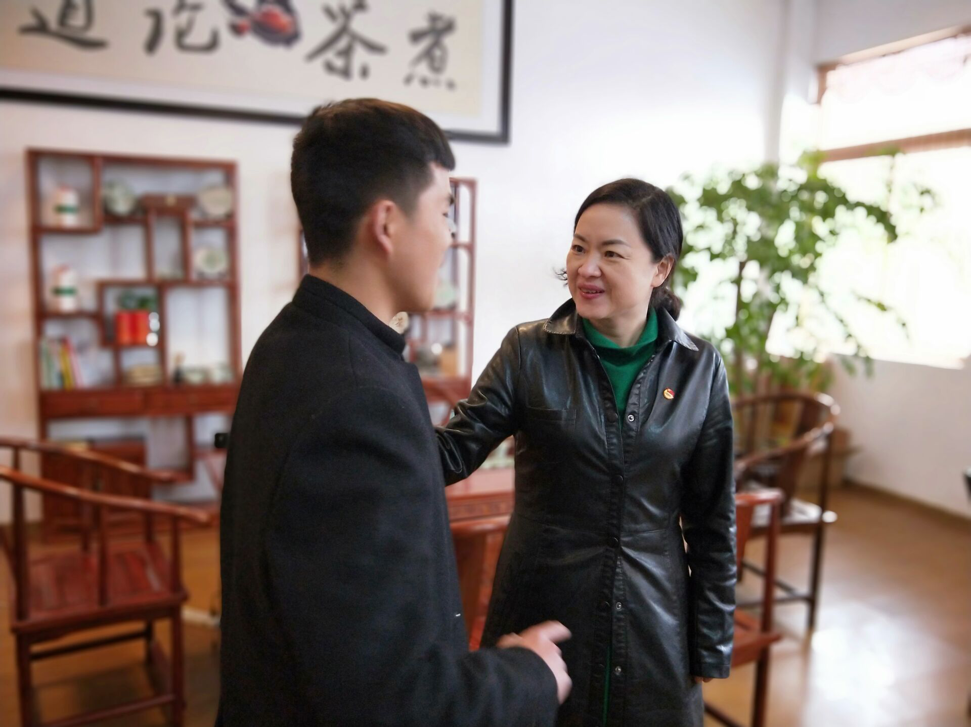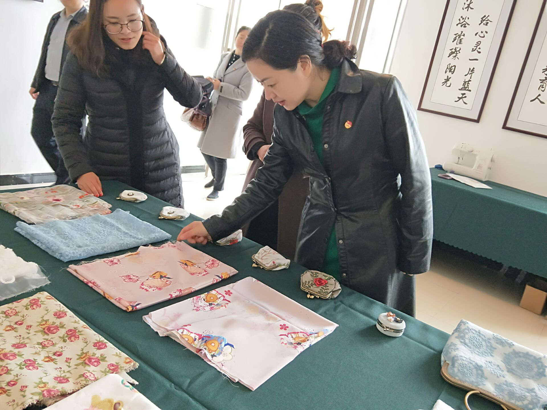 图为永宜副书记参观手工坊社员作品和茶艺社同学交流