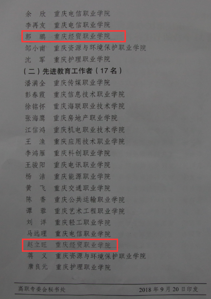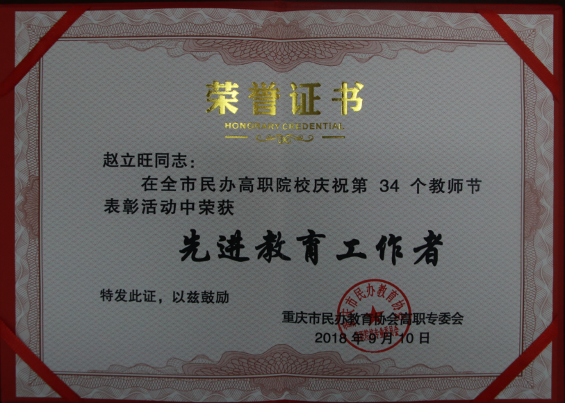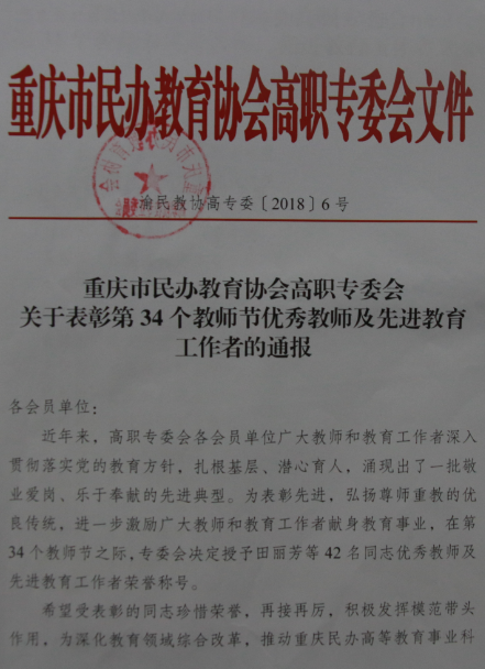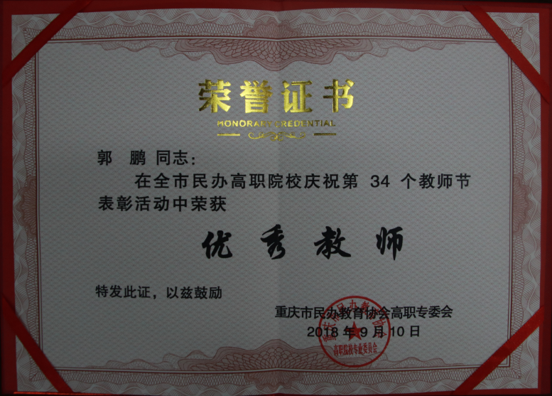 近日,重庆市民办教育协会高职专委员会下发《关于表彰第34个教师节优秀教师及先进教育工作者的通报》,我院郭鹏老师和赵立旺老师分别荣获“优秀教师”和“优秀教育工作者”荣誉称号。
