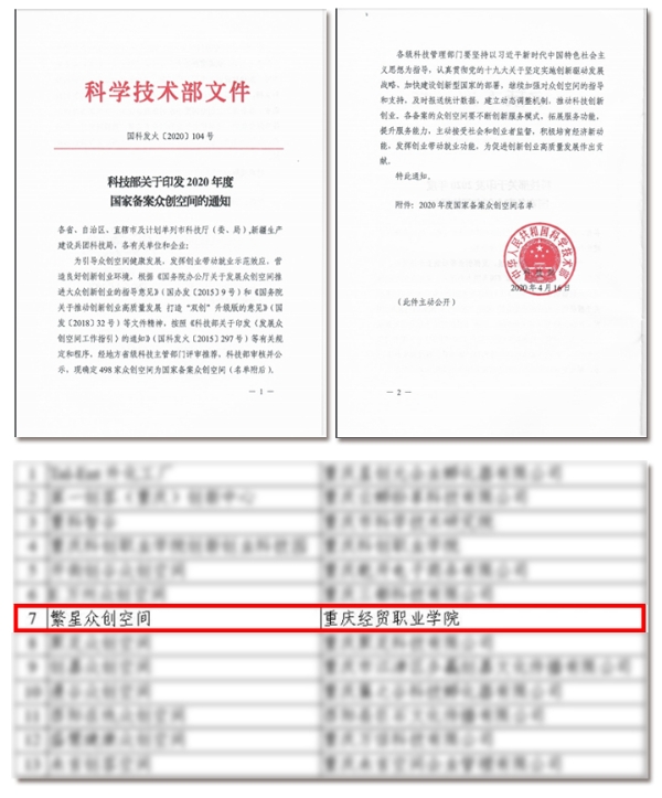 2020年4月23日,科技部印发《关于印发2020年度国家备案众创空间的通知》(国科发火〔2020〕104号),我院繁星众创空间获批国家备案众创空间,成功晋级“国家队”。本次,重庆市众创空间有13家晋升“国家级”,其中高校2家。