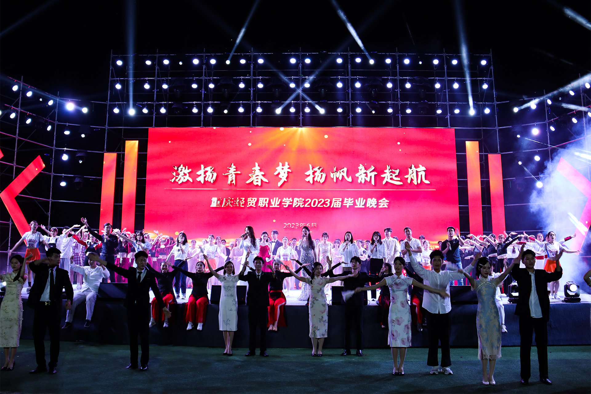 三载时光飞逝过,一朝欢聚话真情。我院以“激扬青春梦,扬帆新起航”为主题的2023届毕业晚会于6月19日20点00分在田径运动场隆重举行。