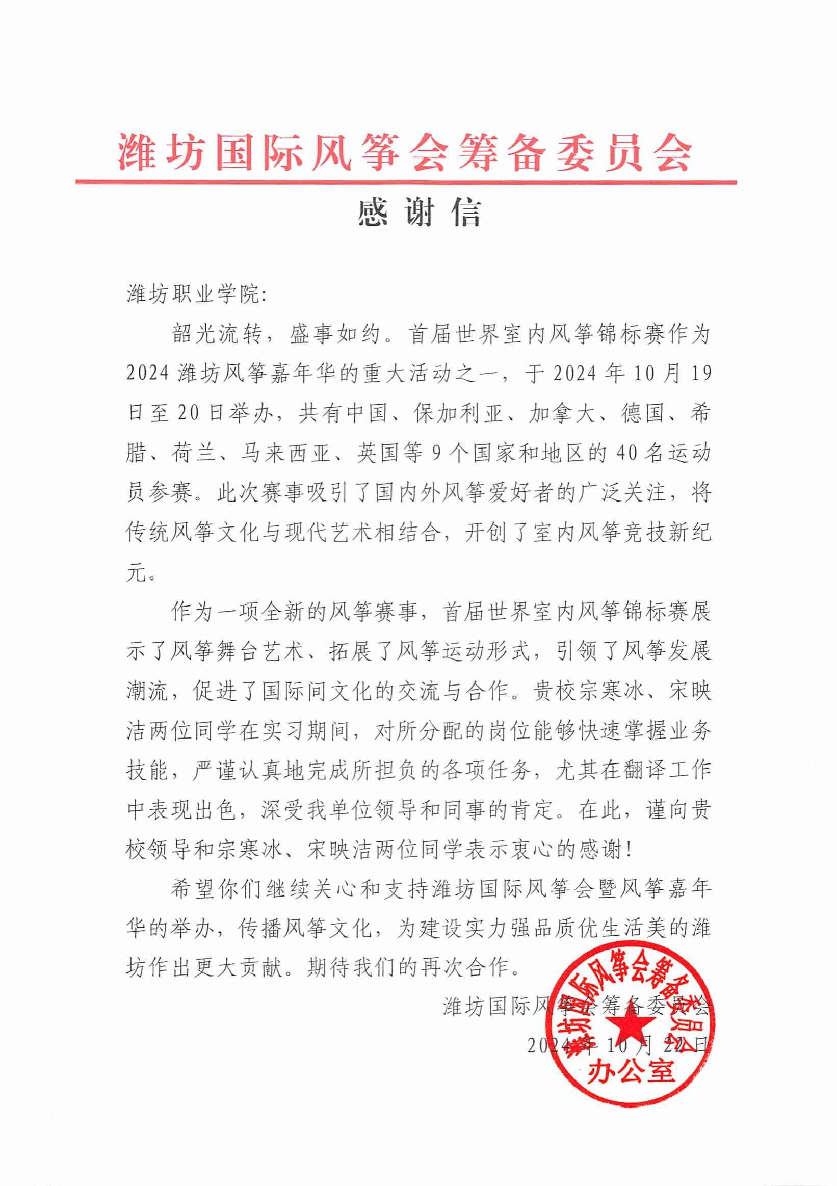 近日,bb贝博艾弗森官方网站收到来自潍坊国际风筝会筹备委员会发来的感谢信,对bb贝博国际商务学院志愿者宗寒冰、宋映洁两位同学在首届潍坊国际风筝会暨风筝嘉年华期间出色的翻译工作表示衷心感谢和高度赞扬。作为一项全新的风筝赛事,首届世界室内风筝锦标赛吸引了来自世界各地40余名运动员参加。bb贝博宗寒冰、宋映洁两位同学在志愿服期间,快速掌握了分配岗位的业务技能,严谨认真地完成所担负的各项任务,尤其在翻译工作中表现出色,深受承办单位领导和同事的肯定。...更多 -