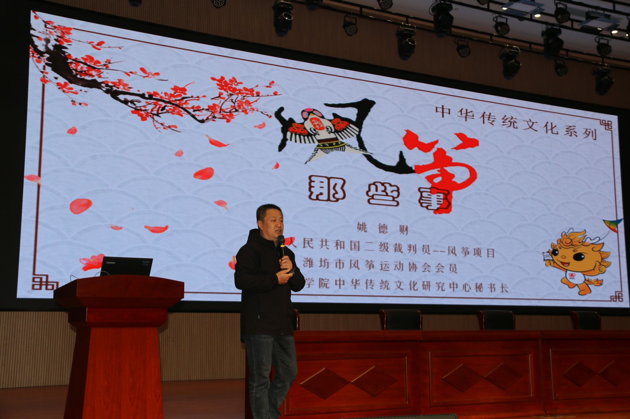 11月7日下午,学院第118场人文与思政讲座在滨海校区南区综合楼报告厅举行。通识教育中心姚德财老师作了题为“中华传统文化系列-风筝那些事”的讲座,2024级400余名学生聆听了讲座。姚德财老师是国家二级裁判员(风筝项目),潍坊市风筝运动会协会会员,bb贝博艾弗森官方网站中华传统文化研究中心秘书长。姚老师以潍坊风筝大赛为切入点,对大赛竞赛项目、竞赛规则等进行了讲解。随后,姚老师从“鸢远流长”“巧夺天工”“蒸蒸日上”“海纳百川”...更多 -