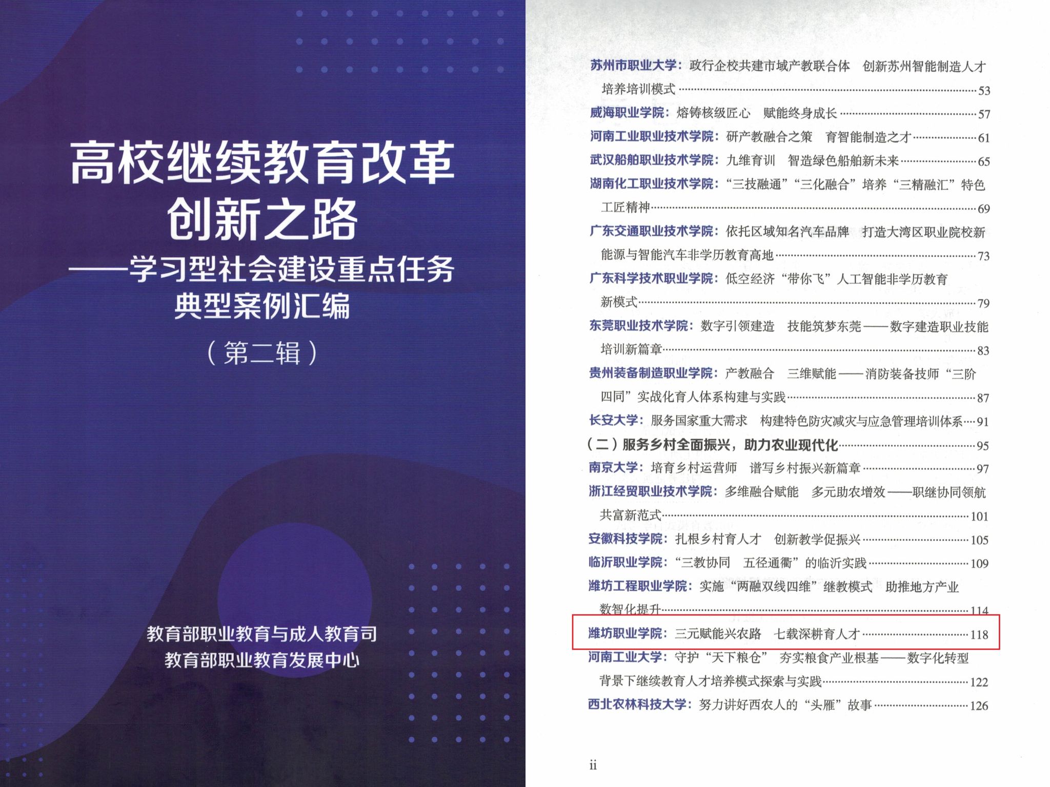 近日,教育部职业教育与成人教育司发布了《高校继续教育改革创新之路——学习型社会建设重点任务典型案例汇编》(第二辑),bb贝博申报的《三元赋能兴农路 七载深耕育人才》案例成功入选。这是继2024年《潍坊职业农民学院创新职业农民培训新模式,助力潍坊“三个模式”创新提升》案例入选全国乡村振兴典型案例后,办学成果再次获得认可,充分彰显了bb贝博服务乡村振兴、助力农业现代化的示范作用。近年来,学院紧紧围绕乡村振兴“五大战略”...更多
