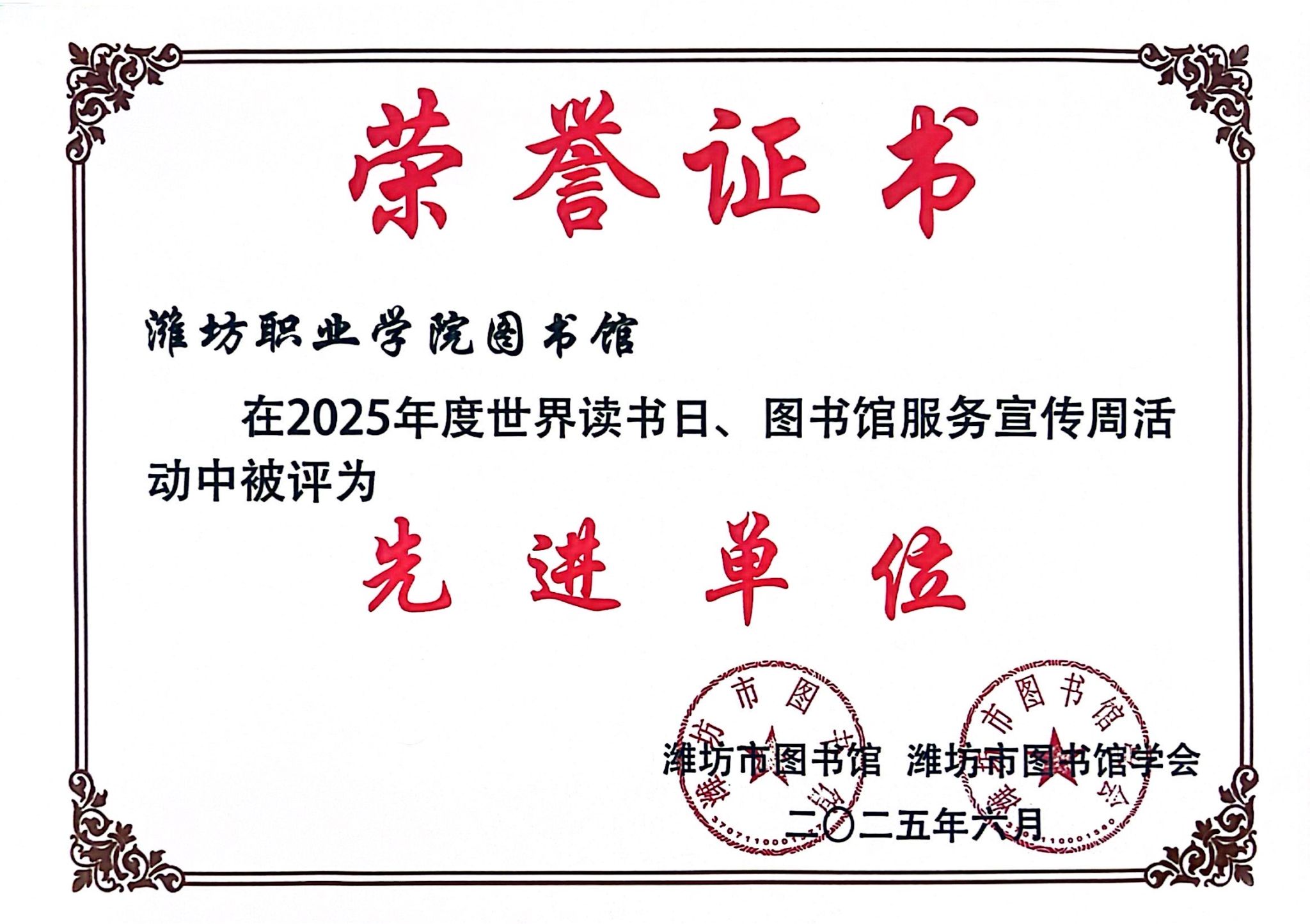 学院图书馆荣获潍坊市2025年度 “世界读书日、图书馆服务宣传周活动” 先进单位称号