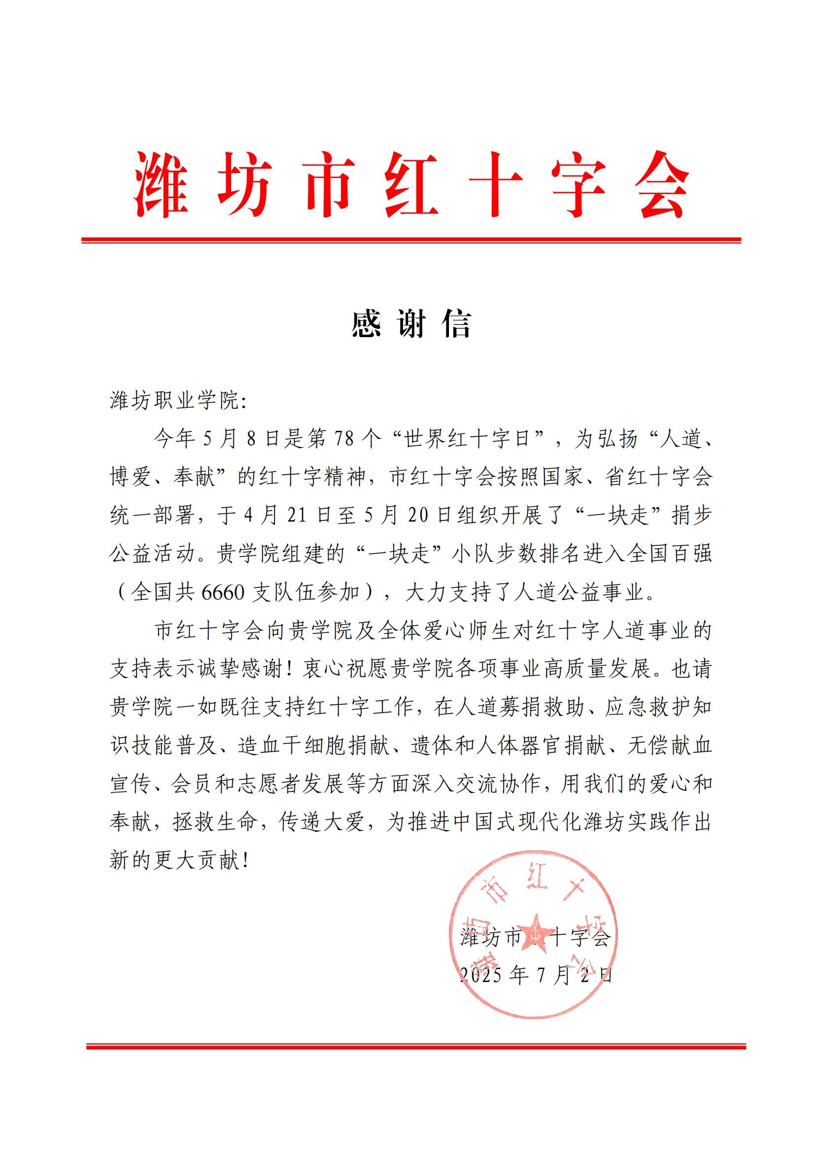 近日,学院收到潍坊市红十字会发来的感谢信,对学院组建“一块走”小队并积极参与“一块走”捐步公益活动予以充分肯定和诚挚感谢。为弘扬“人道、博爱、奉献”的红十字精神,按照市红十字会统一部署,学院于4月21日至5月20日组织师生参加了“一块走”捐步公益活动,小队步数排名进入全国百强(全国共 6660支队伍参加)。学院师生热心参与社会公益活动所展现出的崇德向善、无私奉献的高尚品质,获得了广泛认可。学院始终重视和支持公益事业,...更多 -