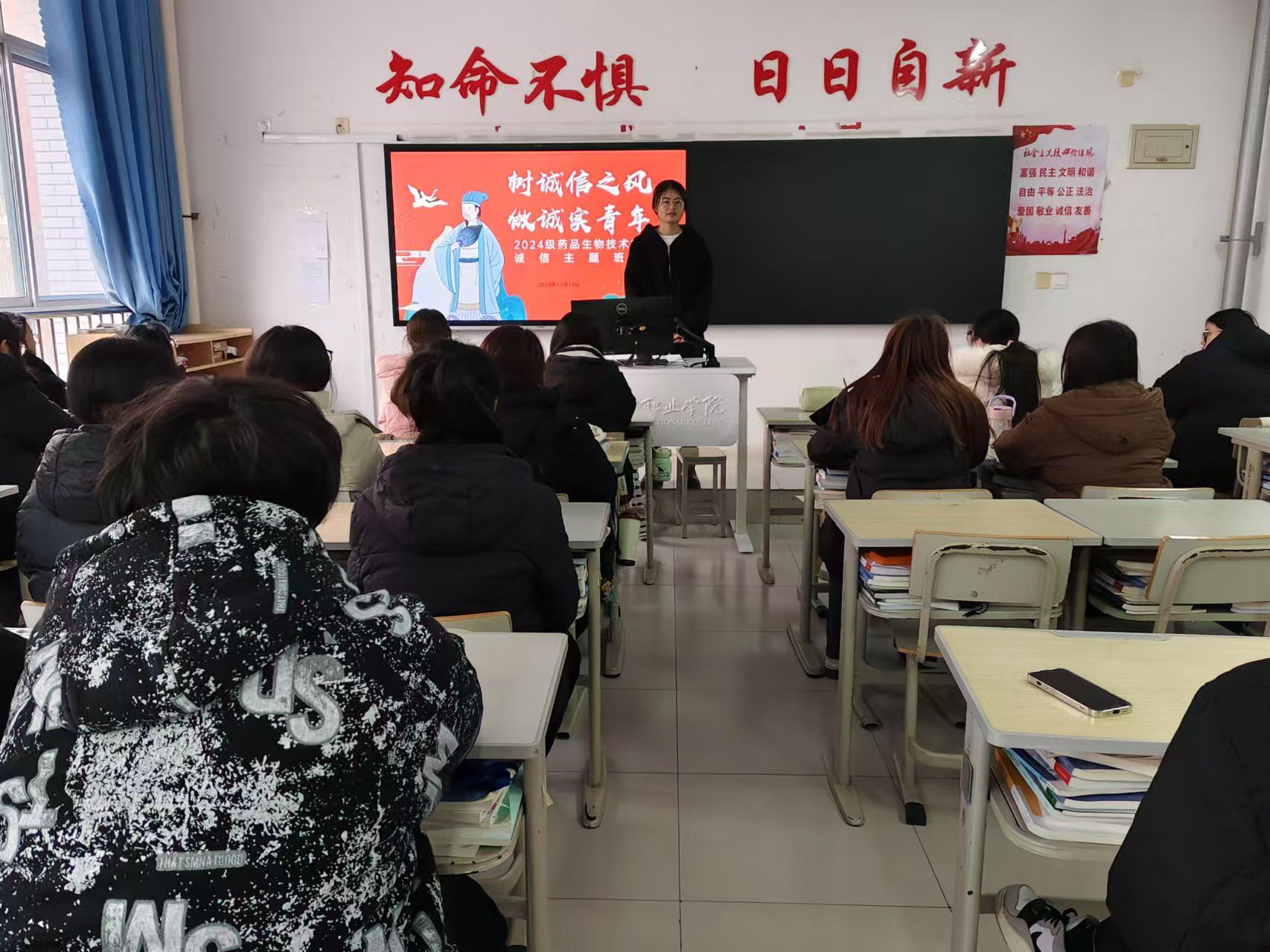 为加强学风建设,进一步弘扬诚信精神,树立良好的考风考纪,食品药品学院各班于12月25日—27日召开诚信考试主题班会。在主题班会上,辅导员老师带领同学们学习《bb贝博艾弗森官方网站考试违纪舞弊处理办法》,指出考试不仅是对知识的检验,更是对道德品质的考验,提醒同学们诚实备考,掌握技巧,勤于思考总结,以最好的状态迎接考试。此外,食品药品学院还通过诚信考试主题板报和标语等方式,在学院内形成浓厚的诚信应考氛围,潜移默化引导同学们诚信考试,...更多 -