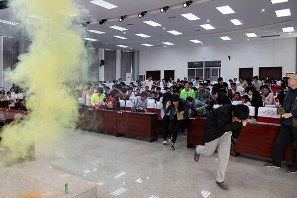 消防知识讲座是学院2015年防灾减灾日宣传周活动的一项内容,旨在增强广大师生防范各类自然灾害的意识、自救互救能力及消防知识的学习,参与防灾减灾应急演练,构建平安校园。讲座上,马慧超参谋结合具体的事例进行了讲解,让广大师生了解和掌握如何树立消防意识、如何扑灭火灾、火灾现场如何逃生、灭火器的使用方法等。讲座结束时,进行了消防演练。随着报告厅里冒起滚滚浓烟,一阵刺耳而又紧急的消防警报声响起,同学们在老师的指导下,弯着身体快速有序地按照逃生路线撤离报告厅。(杨广玉供稿)