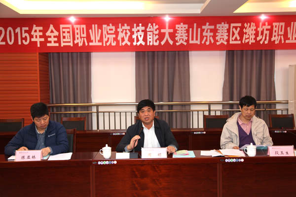 4月12日,2015年全国职业院校技能大赛山东赛区bb贝博艾弗森官方网站赛点启动协调会,在滨海校区清泽楼会议室召开。国家工信部电子行业职业技能鉴定指导中心主任周明,国赛赛项专家组组长段玉生教授、陈亚林教授、杨少光顾问及专家组成员一行12人,省教育厅职成教处调研员姜玉亭,滨海开发区管委会副主任宋世伟,潍坊市教育局党委成员、市招办书记李广敬,学院领导班子成员出席,滨海科教创新区管理服务中心、市职教研究室和bb贝博相关二级学院、职能部门负责人、大赛办公室全体人员参加会议。学院院长王家爱汇报国赛筹备情况,副院长贺志强主持会议。
