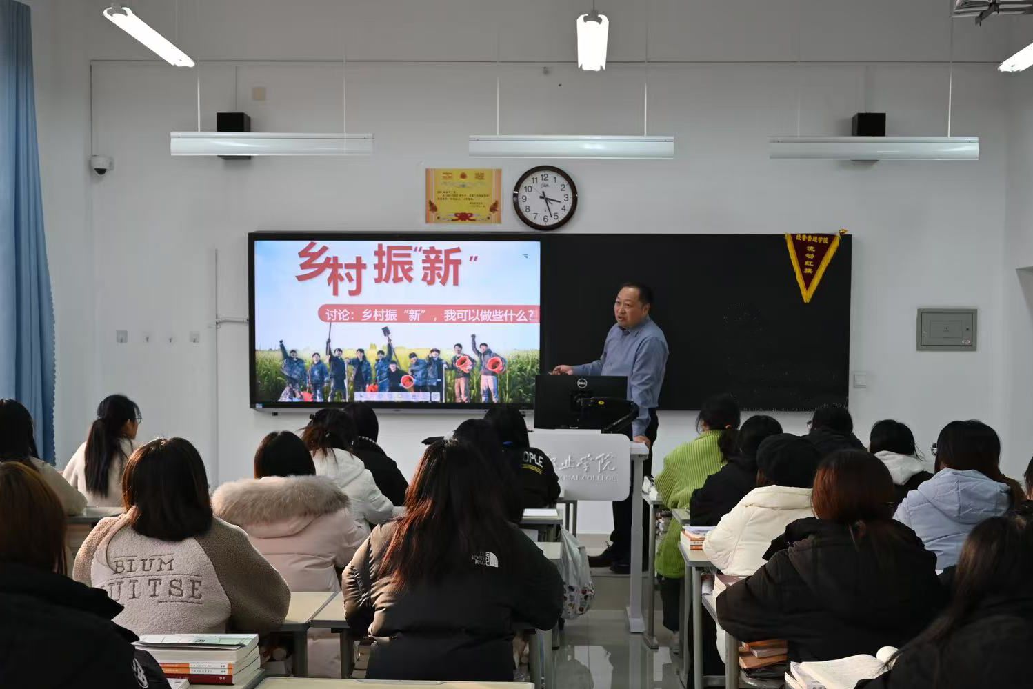 课堂上,付一明通过丰富的案例和翔实的数据深入剖析了乡村振兴战略的核心要义,以及在乡村振兴实施过程中的创新发展理念,详细阐述了产业创新、人才振兴、文化传承、生态宜居、生活富裕等多维度目标,并着重强调了乡村振“新”需要同学们注入新的“青春力量”。他勉励同学们积极参与公益活动与志愿服务,自觉将个人成长的“小目标”融入到党和国家事业发展的“大蓝图”之中,让青春的理想在乡村振“新”的广阔舞台上绚丽绽放。