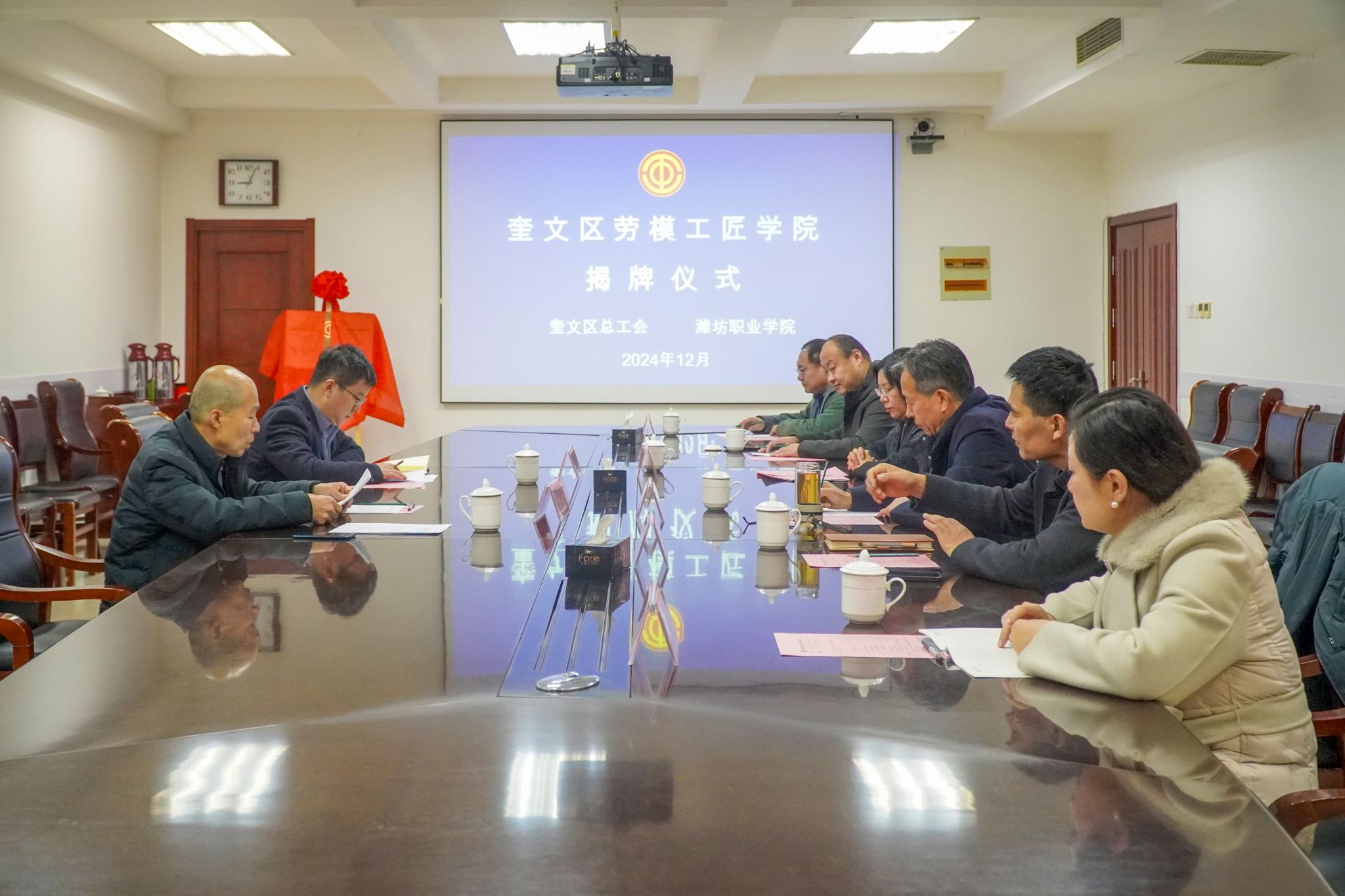 12月31日,奎文区劳模工匠学院在bb贝博艾弗森官方网站奎文校区举行揭牌仪式暨合作发展座谈会。bb贝博艾弗森官方网站党委委员高凌云,奎文区总工会党组成员、一级主任科员李军,学院工会主席,教务处、继续教育学院、机电工程学院负责人及教师代表出席活动。