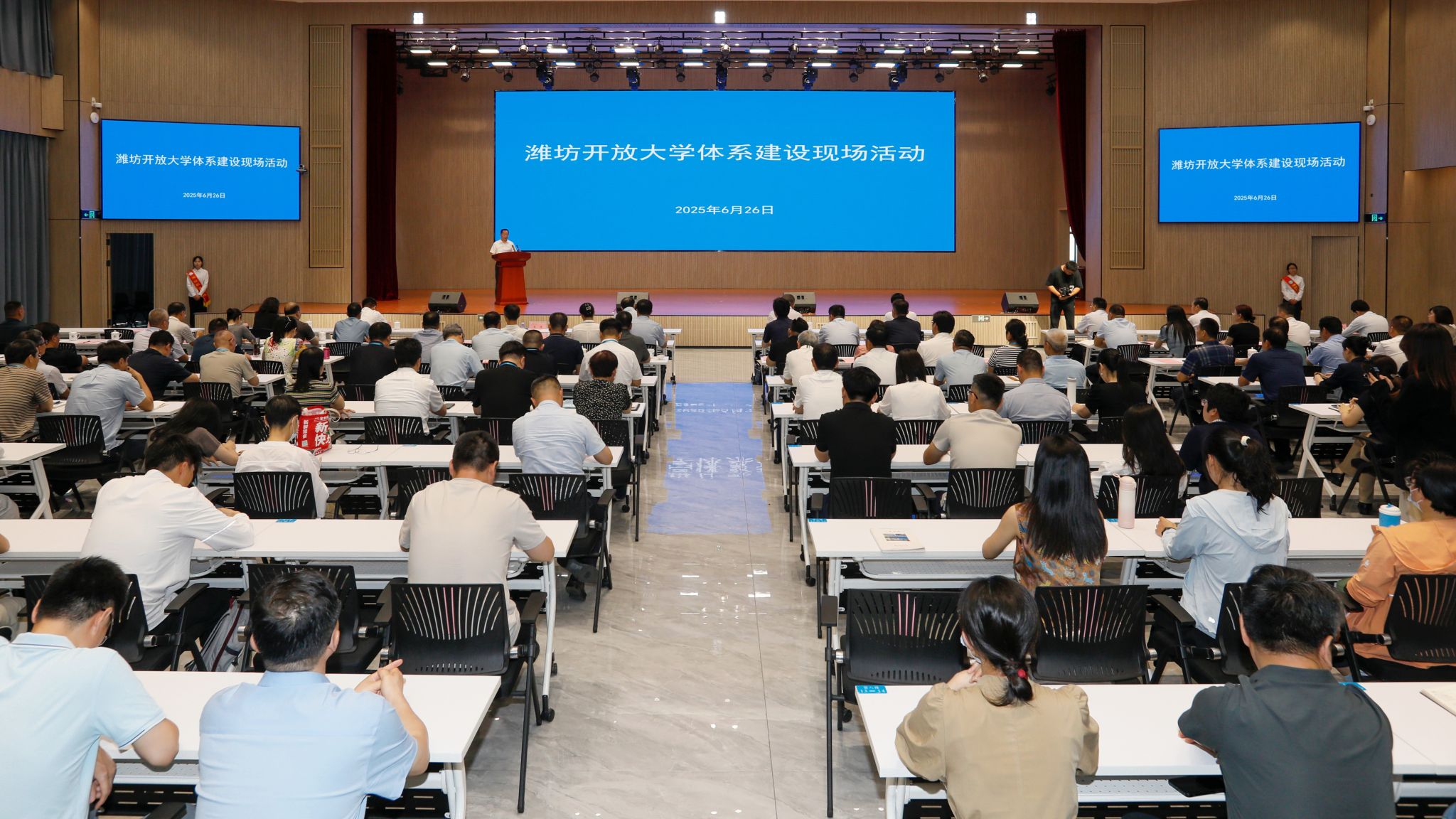 为深入贯彻落实国家开放教育发展战略,加快推进潍坊开放大学体系建设,6月26日,潍坊开放大学体系建设现场活动在bb贝博艾弗森官方网站举行。山东省教育厅二级巡视员邓俊庆、山东开放大学党委副书记、校长司家军,潍坊市政府党组成员、二级巡视员王金祥,山东省教育厅、山东开放大学相关领导,潍坊市机关事业单位运行监管服务中心、市教育局、市人社局、市财政局、潍坊学院、市寒亭区技工学校、各县市区教体局、县级开放大学负责人,学院党委书记王浩、院长韩瑞东,党委委员、副院长付一明及学院相关部门党政主要负责同志、教师代表等200余人参加活动。