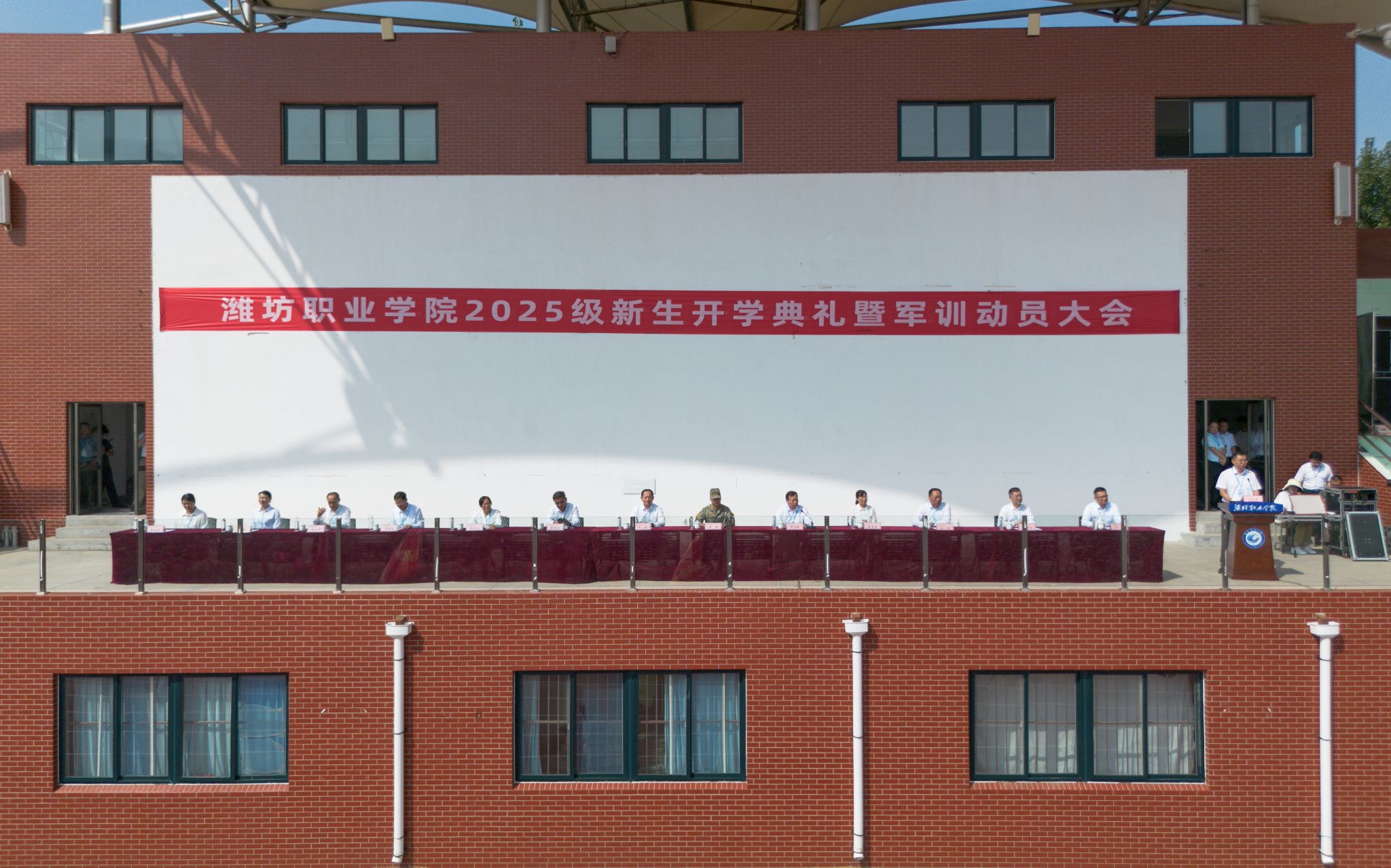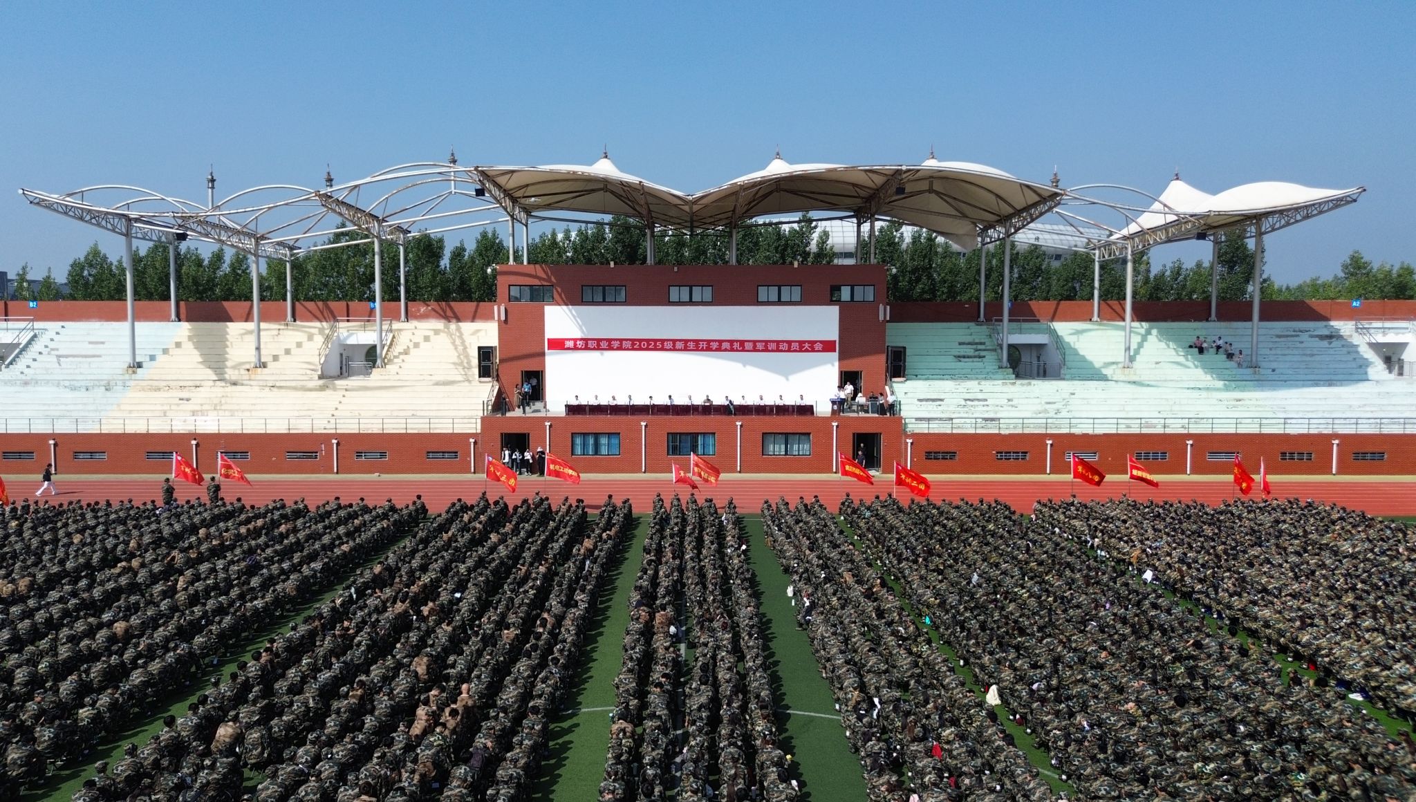 9月9日上午,学院2025级新生开学典礼暨军训动员大会分别在奎文、滨海两校区体育场举行。学院党委书记王浩、院长韩瑞东、驻潍某部队教导员及学院党政领导班子其他成员出席活动,学生工作处、各二级学院党政主要负责同志、分管学生工作负责同志,2025级新生军训团全体教官,2025级新生班辅导员及全体新生参加大会。会议由党委副书记贺志强主持。