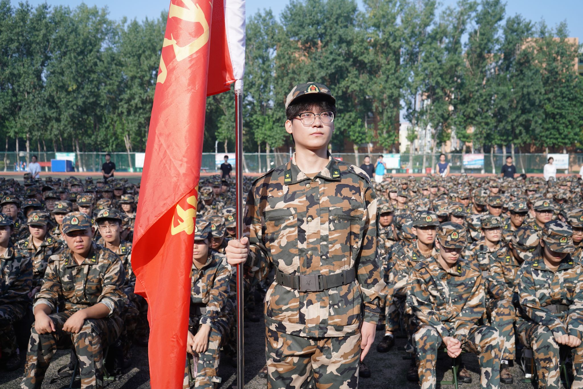 会上,教师代表、高年级学生代表、新生代表分别作了发言。贺志强,党委委员、副院长任培华分别宣布了学院两校区2025年军训团任职令,军训教官代表作了发言,随后军训教官进行了精彩的军事队列动作示范表演。王浩为学院军训团授旗。