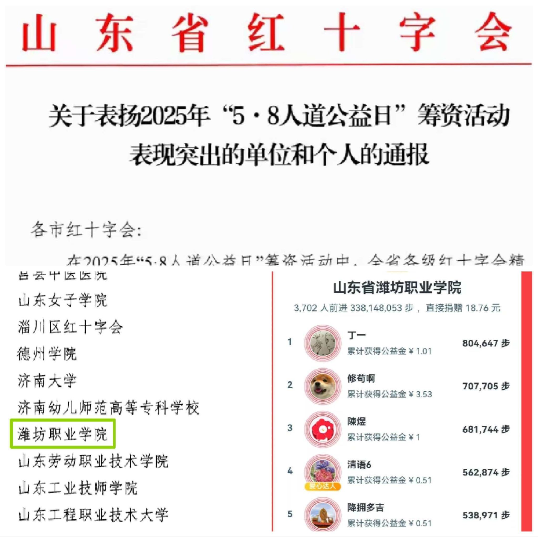 在2025年“5·8人道公益日”筹资活动中,bb贝博积极响应潍坊市和山东省红十字会有关要求,大力弘扬“人道、博爱、奉献”的红十字精神,组建bb贝博艾弗森官方网站“一块走”小队,组织发动广大师生参与“一块走”捐步公益活动。学院3702名师生积极行动,前进3.38亿步,捐步排名进入全国百强(全国共 6660支队伍),有力传播了红十字精神,大力支持了人道公益事业。