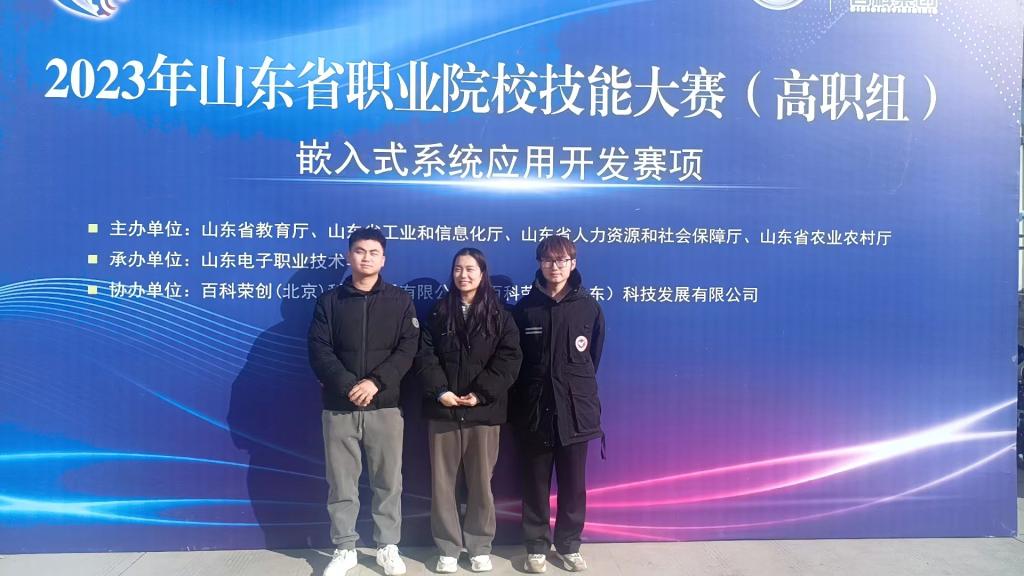 12月2日,2023年山东省职业院校技能大赛(高职组)“嵌入式系统应用开发”赛项在山东电子职业技术学院举行,共有来自全省的45支代表队参赛。bb贝博机电工程学院学生王飞翔、杜佳佳、徐文轩,指导教师王琰琰、张强、杨晓燕、孙春萍组成的代表队,在比赛中沉着应战,通力合作,最终获得该赛项一等奖的好成绩。