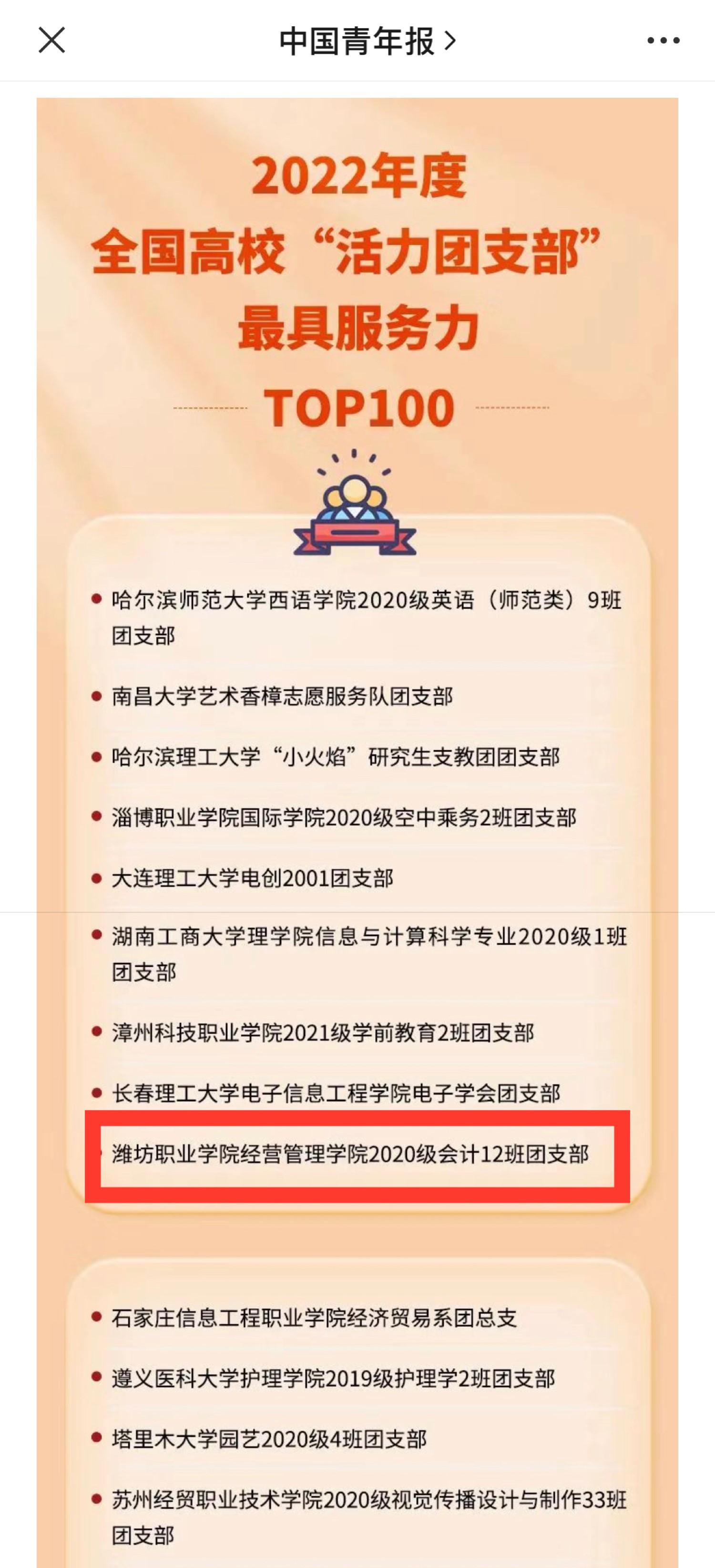 近日,由团中央基层建设部指导、中国青年报社主办的2022年度全国高校“活力团支部”风采全国展示活动落下帷幕。bb贝博经营管理学院2020级会计12班团支部脱颖而出,荣登2022年度全国高校“活力团支部”最具服务力TOP100榜单。