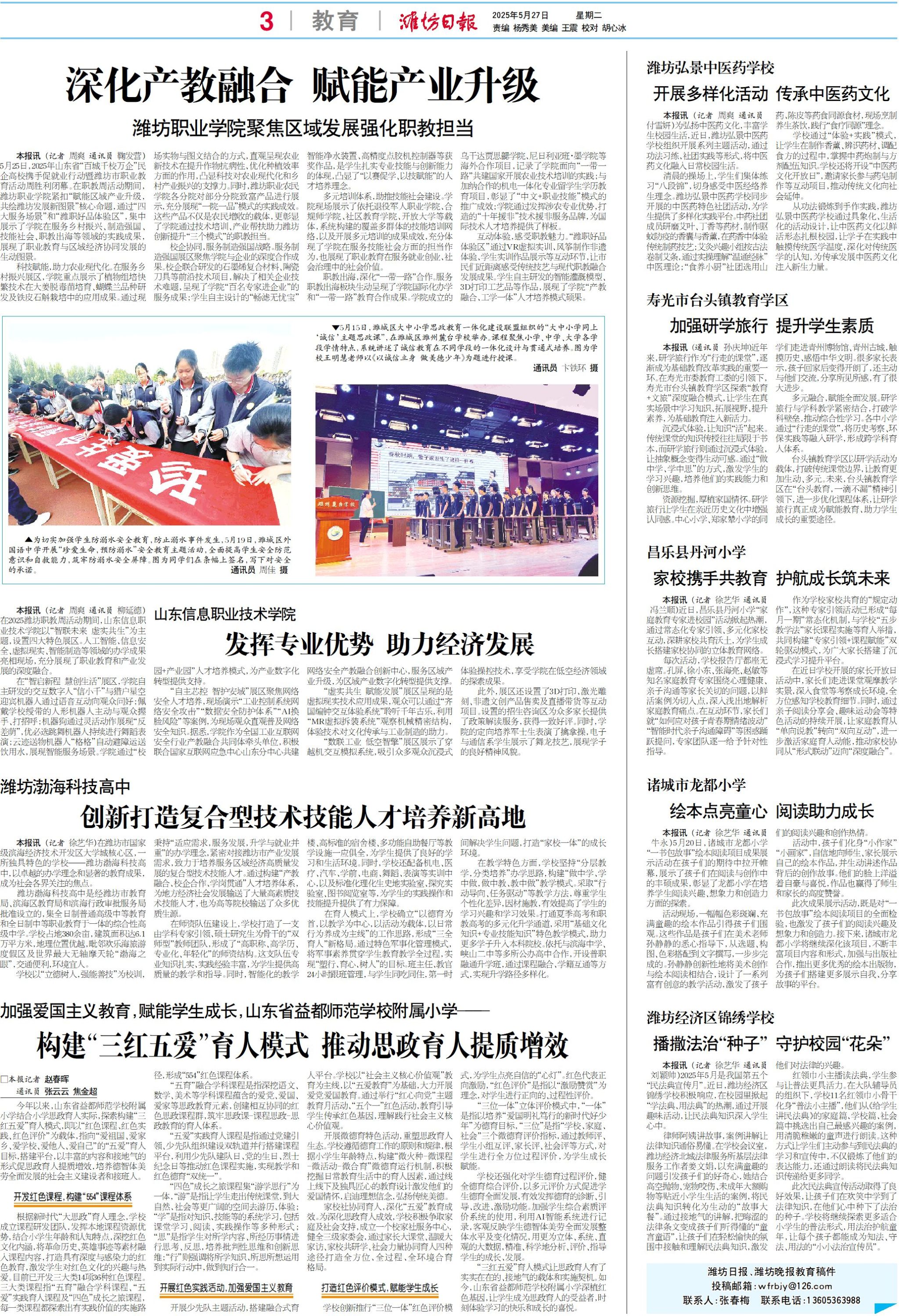 本报讯 (记者 周爽 通讯员 鞠发营)5月25日,2025年山东省“百城千校万企”民企高校携手促就业行动暨潍坊市职业教育活动周胜利闭幕。在职教周活动期间,bb贝博艾弗森官方网站紧扣“赋能区域产业升级,共绘潍坊发展新图景”核心命题,通过“四大服务场景”和“潍职好品体验区”,集中展示了学院在服务乡村振兴、制造强国、技能社会、职教出海等领域的实践成果,展现了职业教育与区域经济协同发展的生动图景。