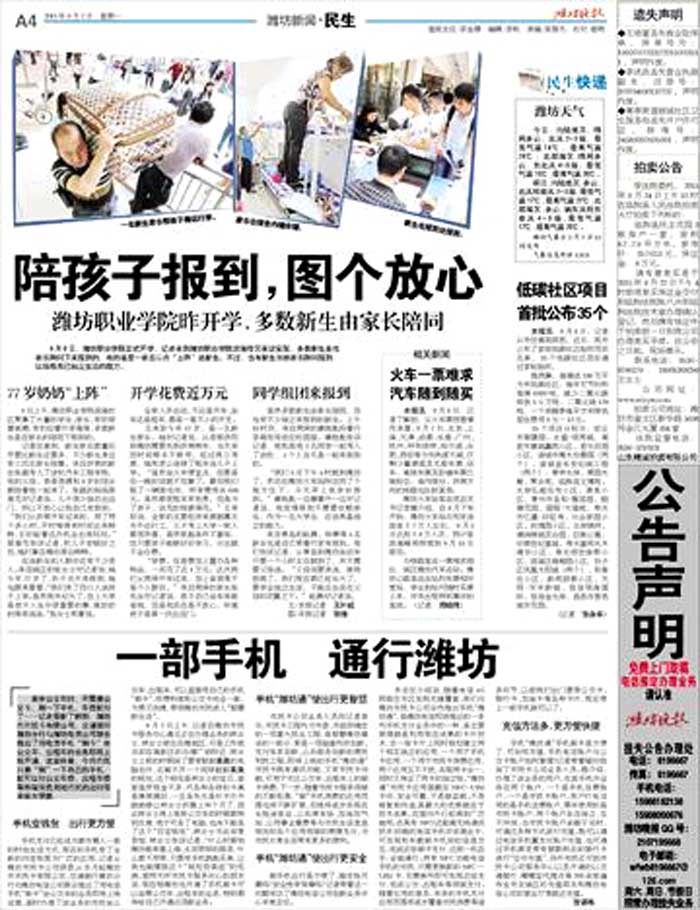 [潍坊晚报]bb贝博艾弗森官方网站昨开学,多数新生由家长陪同