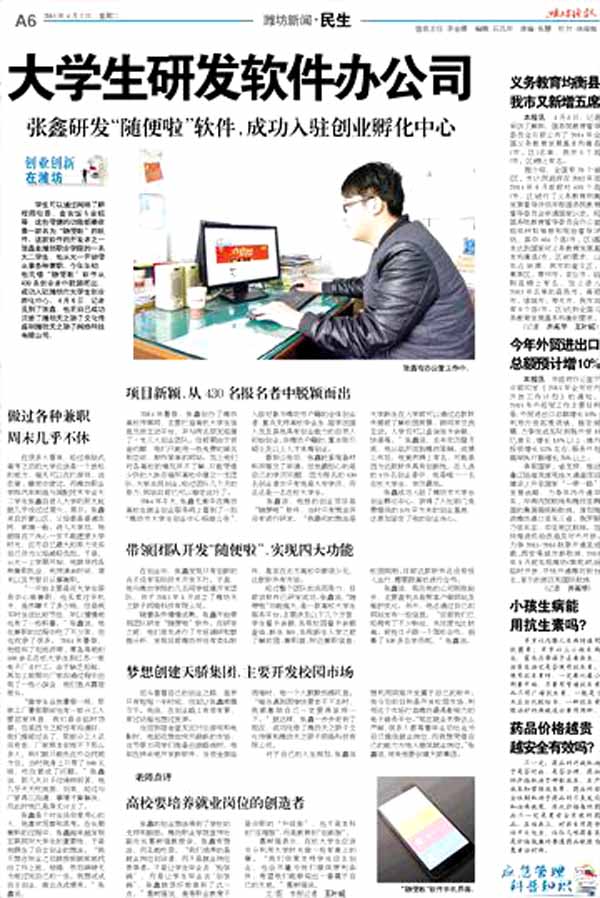 学生可以通过网络了解校园街景、查询饭卡余额等,这些便捷的功能都要依靠一款名为“随便啦”的软件。这款软件的开发者之一张鑫是bb贝博艾弗森官方网站的一名大二学生,他从大一开始便从事各种兼职。今年年初,他凭借“随便啦”软件从430名创业者中脱颖而出,成功入驻潍坊市大学生创业孵化中心。4月6日,记者见到了张鑫,他目前已成功注册了潍坊天之骄子文化传媒和潍坊天之骄子网络科技有限公司。