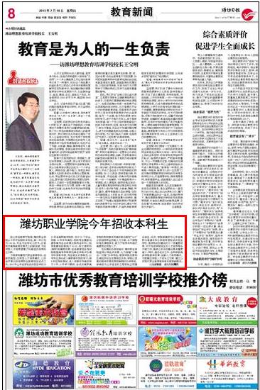 媒体潍职:[潍坊日报]bb贝博艾弗森官方网站今年招收本科生