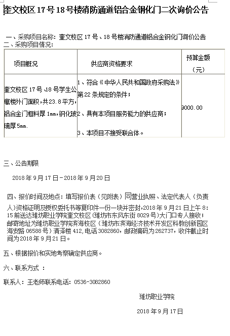 奎文校区17号18号楼消防通道铝合金钢化门二次询价公告