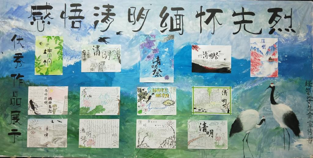 活动中,各班级以手抄报或海报的形式感悟清明,同学们用自己的画笔或写或画地记录下自己所了解的清明习俗或英雄的故事,一份份清明节画报充分表达了同学们对革命先烈的感恩情怀以及对美好生活的向往。同学们用自己的方式解读清明,走近革命烈士,从中强烈地传达出同学们将用坚定的信念和坚强的意志捍卫烈士们的荣誉,用坚持不懈的努力传承烈士们的革命事业的强烈意愿。经过评比,共有15份作品获奖在惠泽1号楼大厅进行展示,供同学们参观、学习和交流。