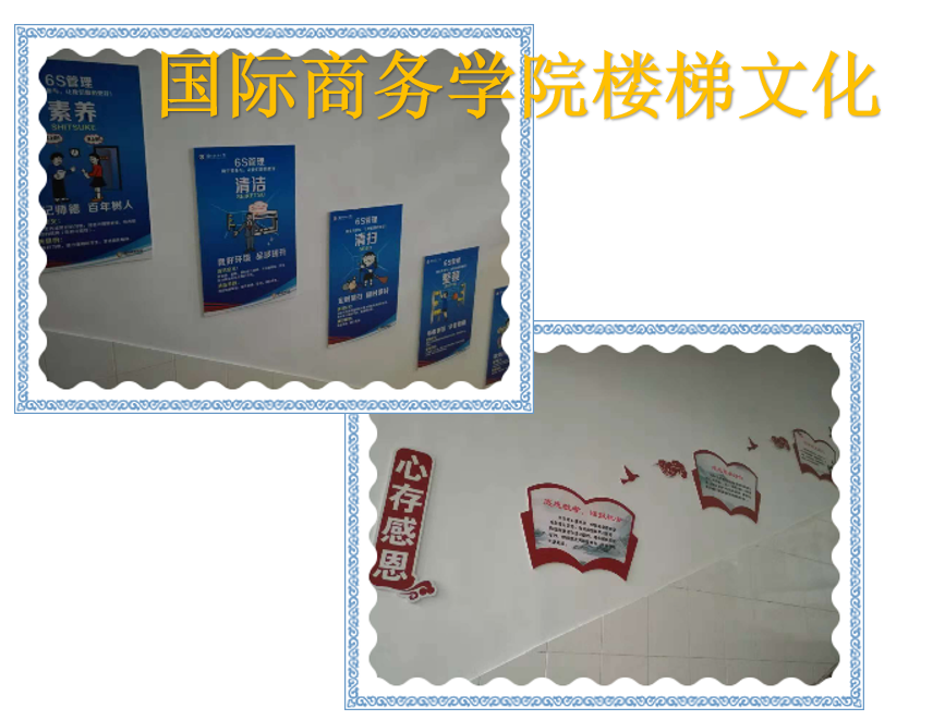 国际商务学院一直本着“不重更重”的理念全力推进优质校建设,为营造以“德”育人的文化育人氛围,国际商务学院成立文化建设工作小组,由主要负责人任组长,分管负责人任副组长,各科室负责人任成员,统一调度,分头行动,历时近两个月,把1号楼装扮一新,整个楼内充满了浓浓的文化气息。