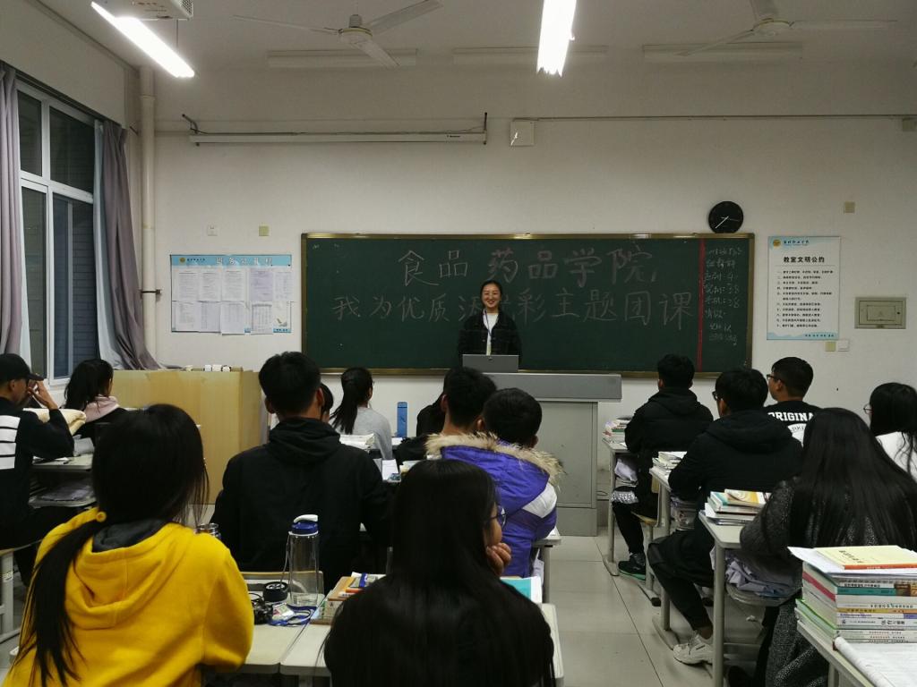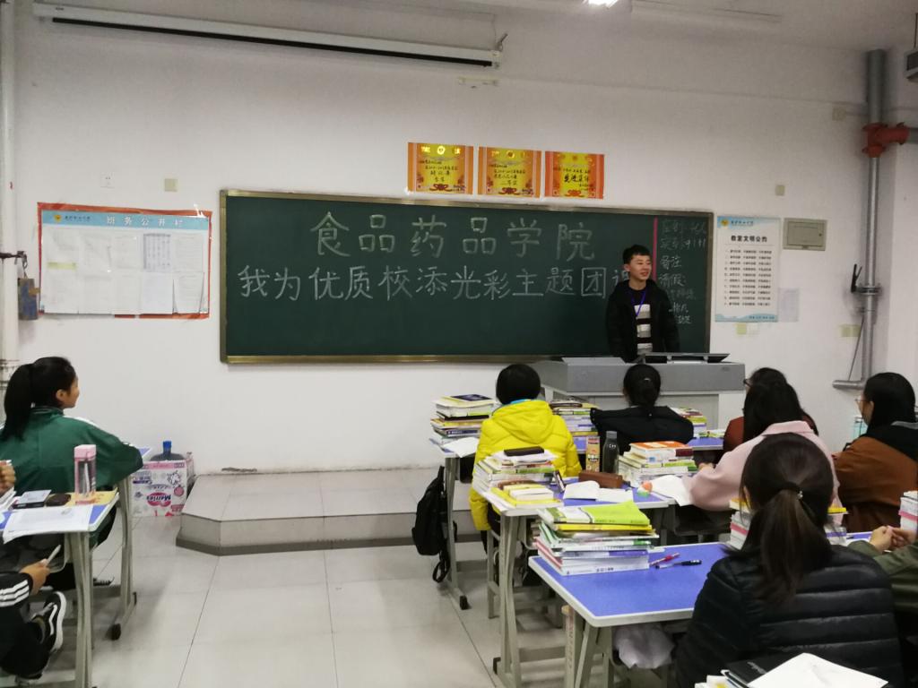 为了激励广大学生积极投身优质校建设,为学院增光添彩,同时展现食品药品学院青年学生良好的精神风貌,增强对学院的凝聚力和向心力,提高学生对学院的认同感、荣誉感、自豪感,11月14日,食品药品学院团总支开展了以“我为优质校添光彩”为主题的团课。