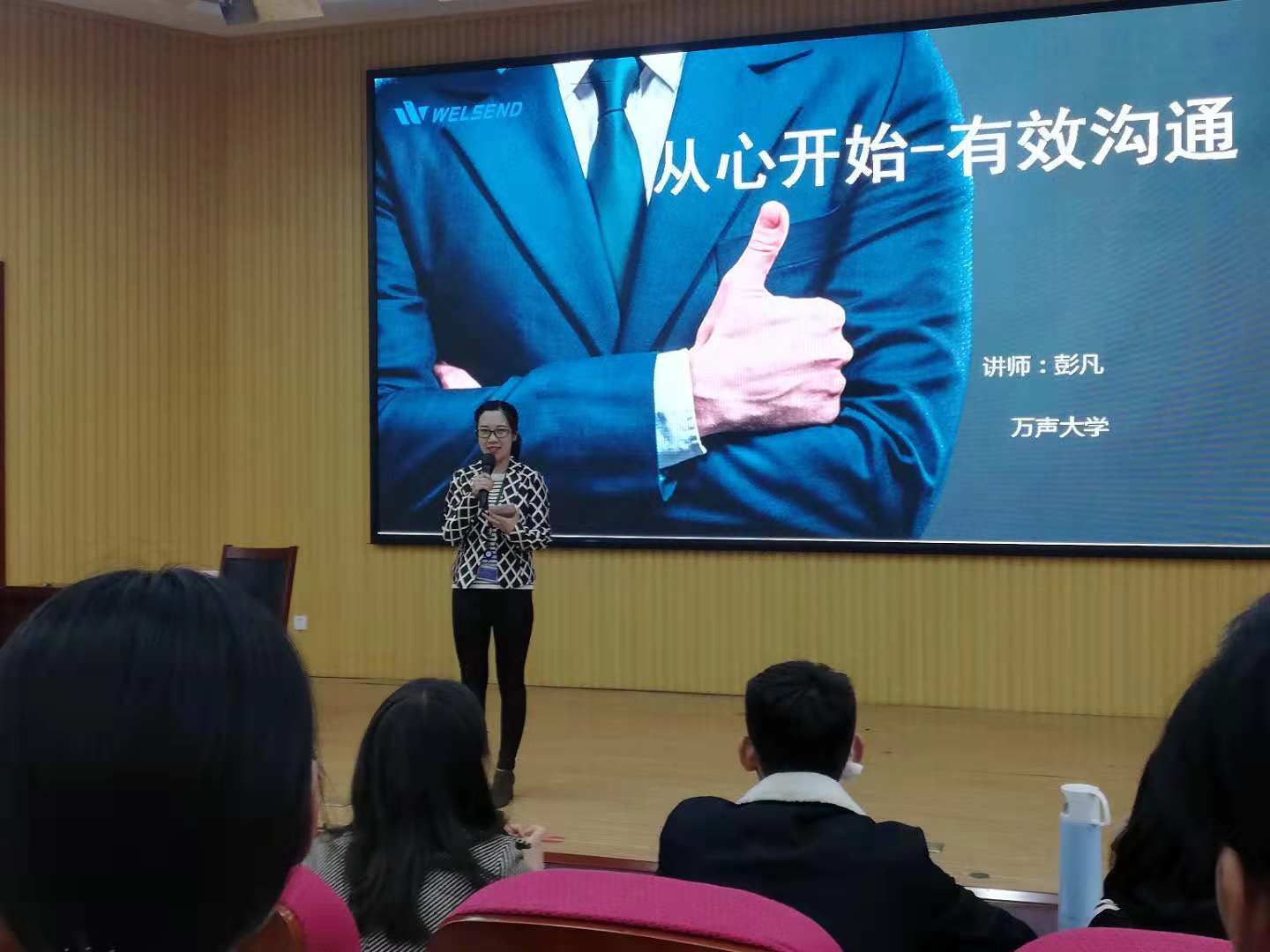 活动将聘请14名企业专家、创业精英,以“导师进课堂”的形式,现身说法,他们将结合自身经历和就业、创业工作实际,与同学们面对面交流,全方位解答大家关心的问题和当前的热门话题。活动共分职场体验、创业讲堂、素质拓展、成果展示四个模块,首堂课,现代服务业学院邀请了万声大学运营中心主管彭丹老师,彭老师多年来一直从事员工培训管理工作,她以“从心开始有效沟通”为主题,将活动分为有效沟通知识概述、沟通能力提升以及归纳总结三个部分向同学授课,通过亲切的互动、巧妙的问答,将抽象的知识生动化,使同学们理解的更加透彻。活动中以马云、王健林等实例为模板,带领同学们模拟职场交流,赢得了同学们的阵阵掌声。最后,彭老师将自己总结出来的七个沟通突破口悉心的讲给大家,还为同学们带来了来自万声大学的相关教材。