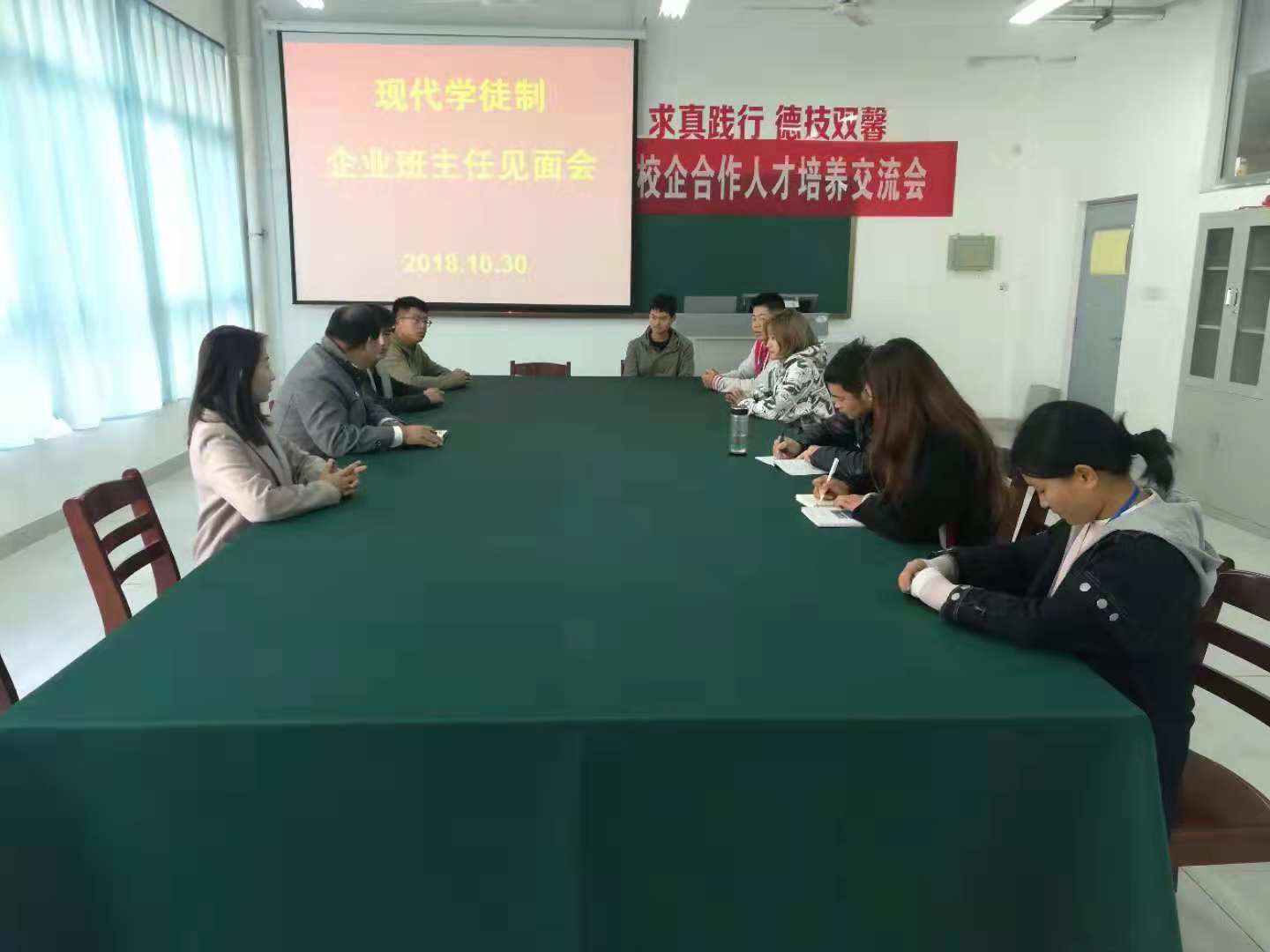 10月31日上午机电工程学院在惠泽2号楼A226会议室召开现代学徒制企业班主任见面会。该院主要负责同志,学院相关专业班级班主任、企业常驻学院班主任及学徒制试点专业班级学生代表参加见面会。