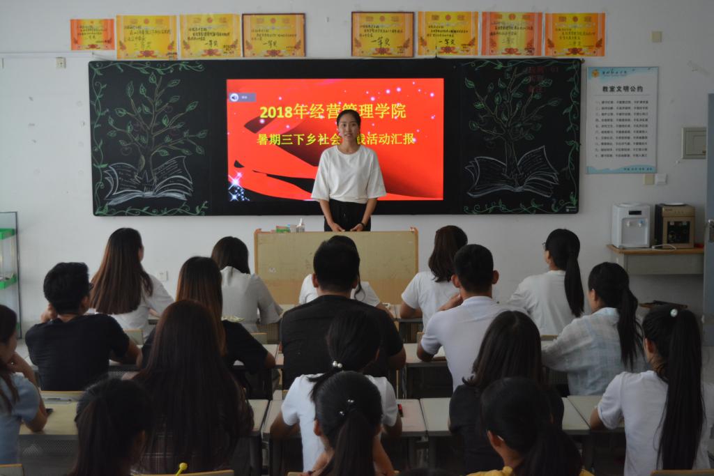 为了更好的贯彻和落实山东省大学生志愿者暑期“三下乡”精神,给各班级暑期实践活动交流搭建平台。9月6日,经营管理学院举行暑期社会实践汇报评比活动。