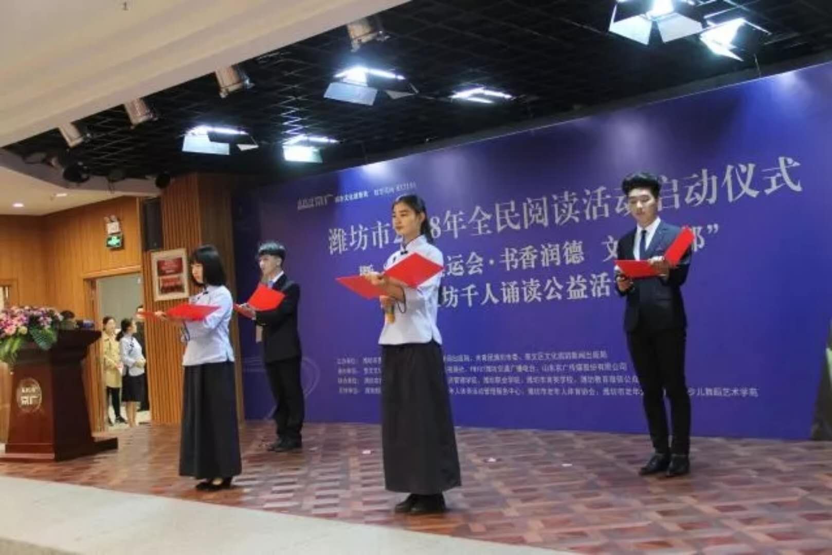 为贯彻落实关于建设学习型社会要求,推进潍坊市“全民阅读”活动深入开展,提高学生的文明素质。4月22日上午,文化创意学院100余名学生前往潍州大讲堂参加潍坊市“京广读运会·千人诵读”活动。