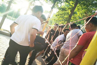 拓展活动围绕“交流、沟通、团结、创新”四个主题,分为四个小组,每个小组设计团队口号和队徽,通过“齐眉齐心”、“解手节”、“同舟共济”、“荒岛求生”、“穿越电网”五个项目分别展开。项目结束,每个队员针对所出现的问题进行轮流发言,找出自己的不足,发现团队中存在的问题,并提出解决的方法。老师会针对活动中出现的问题进行总结并进行深度剖析,让大家更加深刻的了解活动的意义。