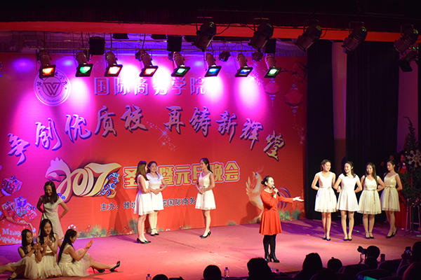 12月22日,国际商务学院“争创优质校•再铸新辉煌”2017圣诞暨元旦晚会在奎文校区报告厅举行。学院副院长贺志强及各部门、二级学院负责同志与国际商务学院全体师生观看了晚会。