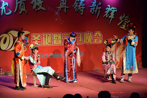 伴着绚丽的灯光和震撼的音乐,开场舞《Shadow ninja》拉开了晚会的帷幕。中、英、韩三语主持人盛装登场宣布晚会正式开始。晚会节目精彩纷呈,有抒情的歌曲串烧《南山南+梦一场》、《偏爱宁静的北京》,有劲爆动感的潮流时尚街舞《bangbangbang》,富有韩国古典风韵的《大长今》,激情澎拜的《IF YOU DO》,优雅动人的歌伴舞《年轮》,幽默诙谐的舞蹈《咋了爸爸》,为观众们带来了一场精彩绝伦的视听盛宴。饶有风趣的相声《我的大学生活》,小品《地铁偶遇》、《甄嬛后传》以夸张的动作,风趣的言语赢得了满堂喝彩。由国际商务学院教师带来的劲舞《Crazy Dance》和手语诗朗诵《隐形的翅膀》节目,展现了老师们活力四射、和蔼可亲的一面,为晚会增添了绚丽的一笔。国际商务学院学生会学生以学院创建优质高职校为目标,结合自己工作的实际,用高昂的士气和坚定的信心,送出以《创优质校•圆潍职梦》为主题的新年寄语:“青春潍职,我们用歌声去舞动;最美潍职,我们用努力去创造;优质潍职,我们用文明去构建;梦想潍职,我们用智慧去谱写;让我们以昂扬的士气,让我们用青春的韶光,共同争创优质高校,圆我潍职梦想。”将晚会推向了高潮。