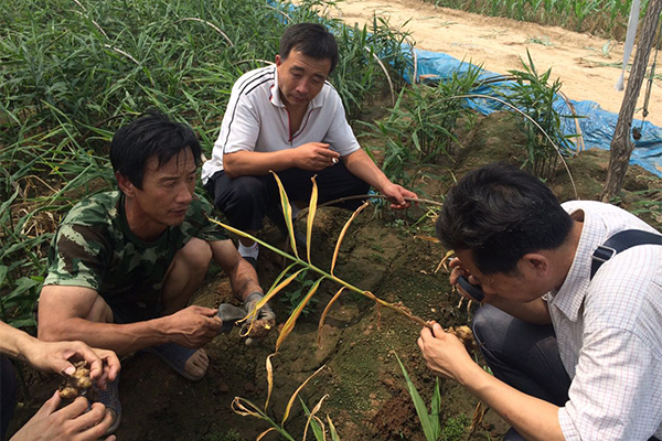今年,黄楼部分大姜地块出现死棵现象,姜农根据往年的管理经验和农资厂家提供的产品进行了多次防治,效果十分不明显。经过徐桂平老师的现场观察诊断,结合实验室观察,得出了比较肯定的结论,开出了相应的防治方案。应当地农民的邀请,王振华老师对玉米田中出现的生长异常现象进行了分析对比,断定是微量元素缺乏症,给农民提出了施肥方案。(孙显慧供稿)