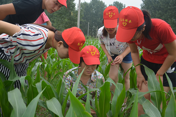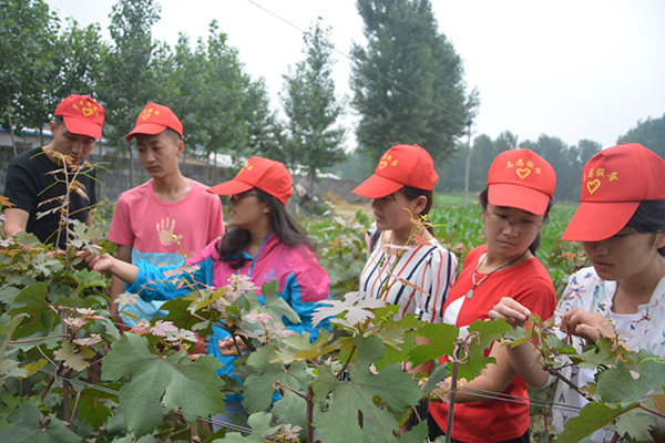 实践团队在指导老师的带领下,与峡山生态经济发展区郑公街道潘刘屯村包村“第一书记”安守强同志对接,随村主任等工作人员和部分农户一起深入田间地头,了解当地农业生产和农村经济发展现状。师生通过对当地的村容村貌、人员结构、气候、土壤、生态环境及交通等特点的了解,和村委工作人员一起分析了当地发展中存在的问题、发展生态农业的有利条件,并提出了发展生态旅游农业的设想。同时青年志愿者们在bb贝博农业生产专家席敦芹教授的指导下,对玉米、酿酒葡萄的生长进行了观察,席教授耐心细致的指导青年志愿者们识别玉米生长常见病虫害、辨别酿酒葡萄与食用葡萄的不同,通过对比不同田地的葡萄生长状况,让同学们认识到了精细化管理的重要性。