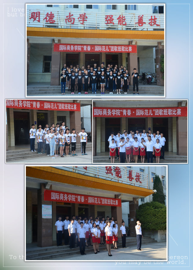 为了增强班级凝聚力,展现学生青春风采,6月18日下午,国际商务学院“青春–国际范儿”团歌班歌比赛在奎文校区1号楼前举行。该院奎文校区全体中高职学生参加了比赛,班主任们担任了评委。